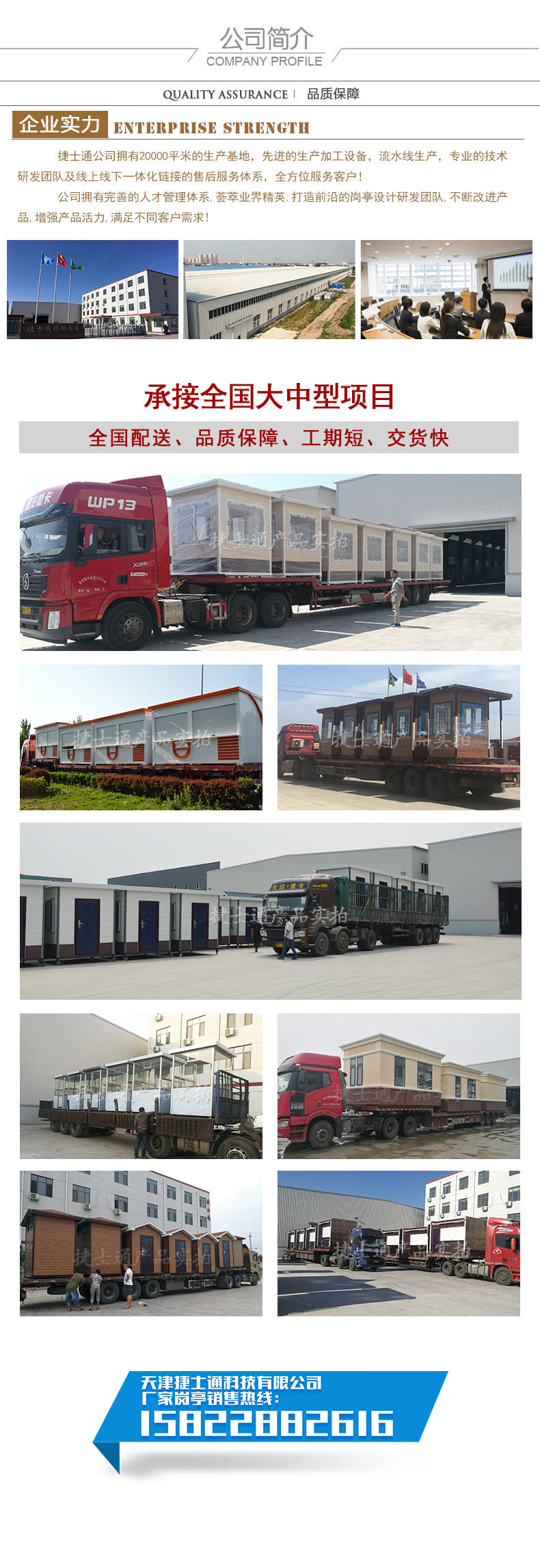 天津市捷士通科技有限公司的產(chǎn)品涵蓋了包括保安崗亭、收費崗亭、志愿者服務亭、城市報刊亭、移動警務室、治安崗亭、吸煙亭、設備房、售賣亭、環(huán)保移動廁所、環(huán)保移動宿營房、微型消防站、森林防火檢查站、木制別墅、戶外辦公室等景區(qū)環(huán)保移動房屋系列產(chǎn)品。捷士通房屋公司按照“立足天津,面向三北,服務全國”的戰(zhàn)略理念,在國內(nèi)設立了數(shù)十家經(jīng)銷商,營銷及服務網(wǎng)絡遍及全國,在國外也擁有廣泛的銷售渠道