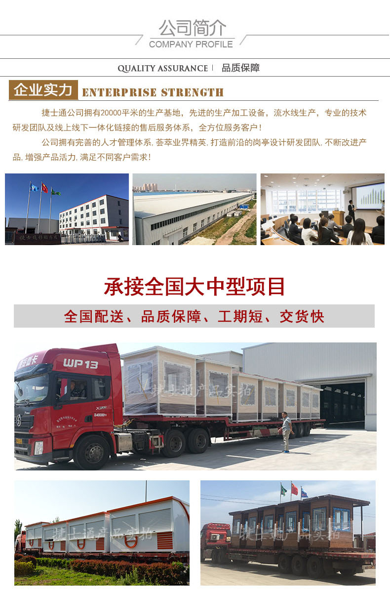 天津市捷士通科技有限公司的產(chǎn)品涵蓋了包括保安崗?fù)?、收費(fèi)崗?fù)ぁ⒅驹刚叻?wù)亭、城市報(bào)刊亭、移動(dòng)警務(wù)室、治安崗?fù)?、吸煙亭、設(shè)備房、售賣(mài)亭、環(huán)保移動(dòng)廁所、環(huán)保移動(dòng)宿營(yíng)房、微型消防站、森林防火檢查站、木制別墅、戶外辦公室等景區(qū)環(huán)保移動(dòng)房屋系列產(chǎn)品。捷士通房屋公司按照“立足天津,面向三北,服務(wù)全國(guó)”的戰(zhàn)略理念,在國(guó)內(nèi)設(shè)立了數(shù)十家經(jīng)銷(xiāo)商,營(yíng)銷(xiāo)及服務(wù)網(wǎng)絡(luò)遍及全國(guó),在國(guó)外也擁有廣泛的銷(xiāo)售渠道。